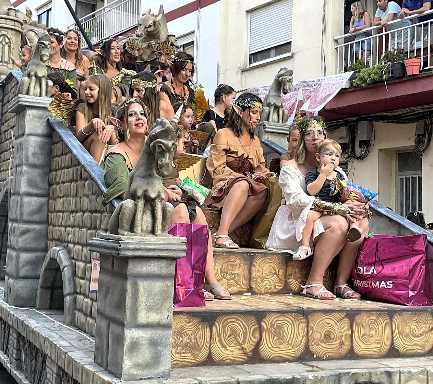El gran carro de la Murta sale a recorrer las calles, cubriendo el ambiente con su fragancia fresca y recibe los primeros aplausos de la multitud. Alrededor de las ocho de la tarde, la cabalgata parte hacia San Luis en medio de la música, los gritos de saludos y admiración y la algarabía festiva. Grandes y suntuosas carrozas se desplazan por las calles llenas de hombres, mujeres y niños con trajes y atuendos relacionados con cada tema dedicado. Las comparsas de jóvenes enérgicos y bulliciosos bailan y cantan al ritmo de la banda de música mientras llevan disfraces multicolores.