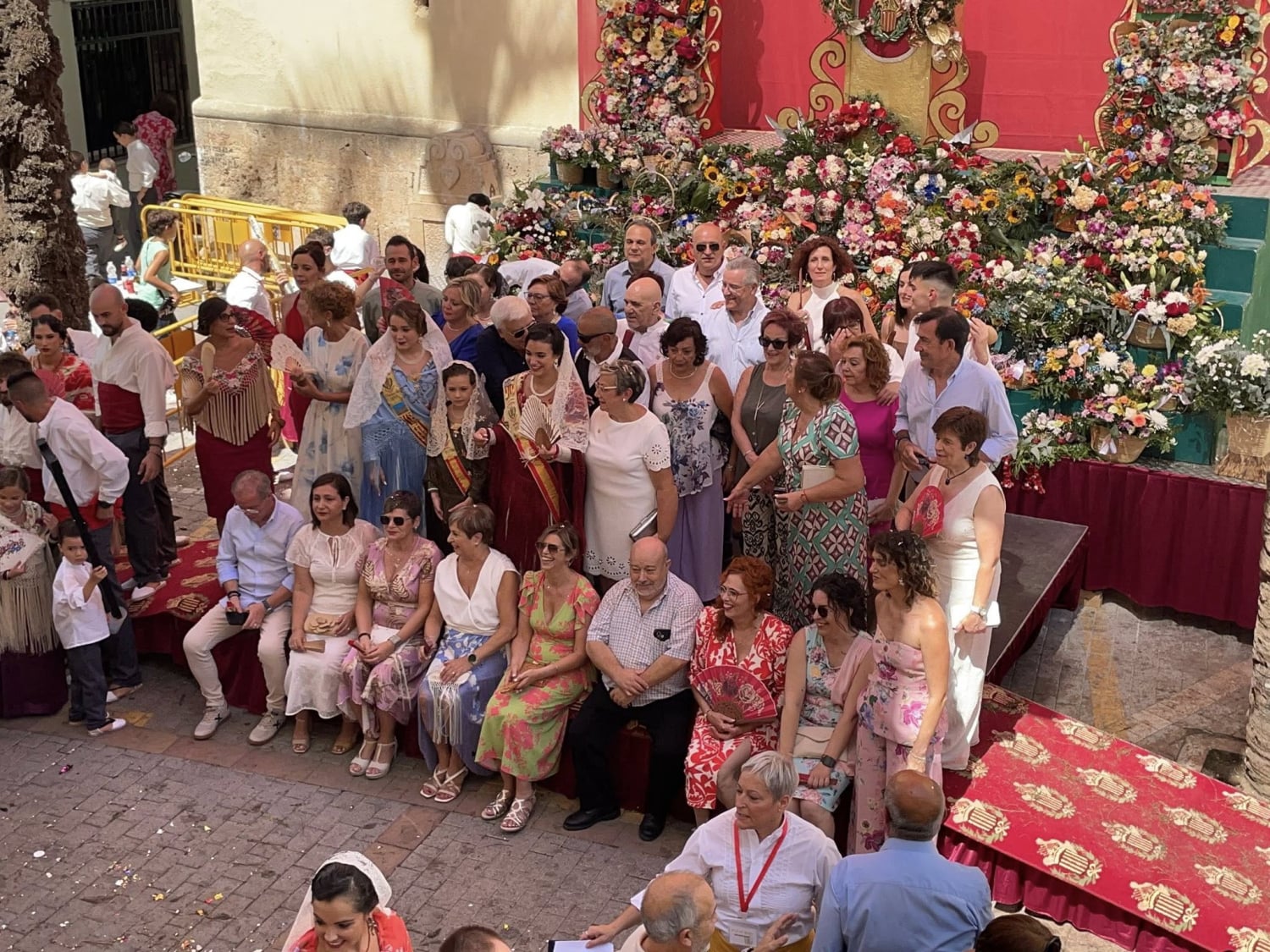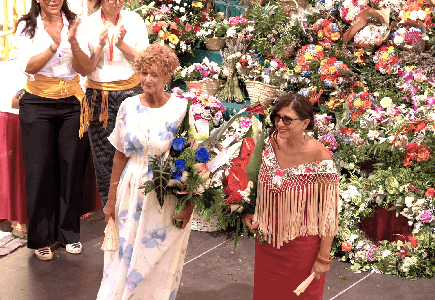El monumento floral a los pies de la virgen comienza a plagarse de puntos multicolores y de ornamentos fastuosos y monumentales, formados por las flores. La ultimas flores para la virgen son depositadas por la Representante y Reinas Mayor e Infantil de la Fiesta del Mantón, que con lagrimas en los ojos rezan a la virgen mientras escuchan las vibrantes y triunfantes notas del himno de los Feos que la banda desgrana cerca de ellas.