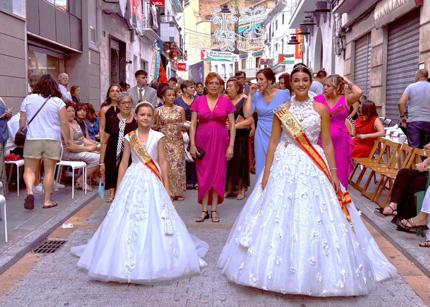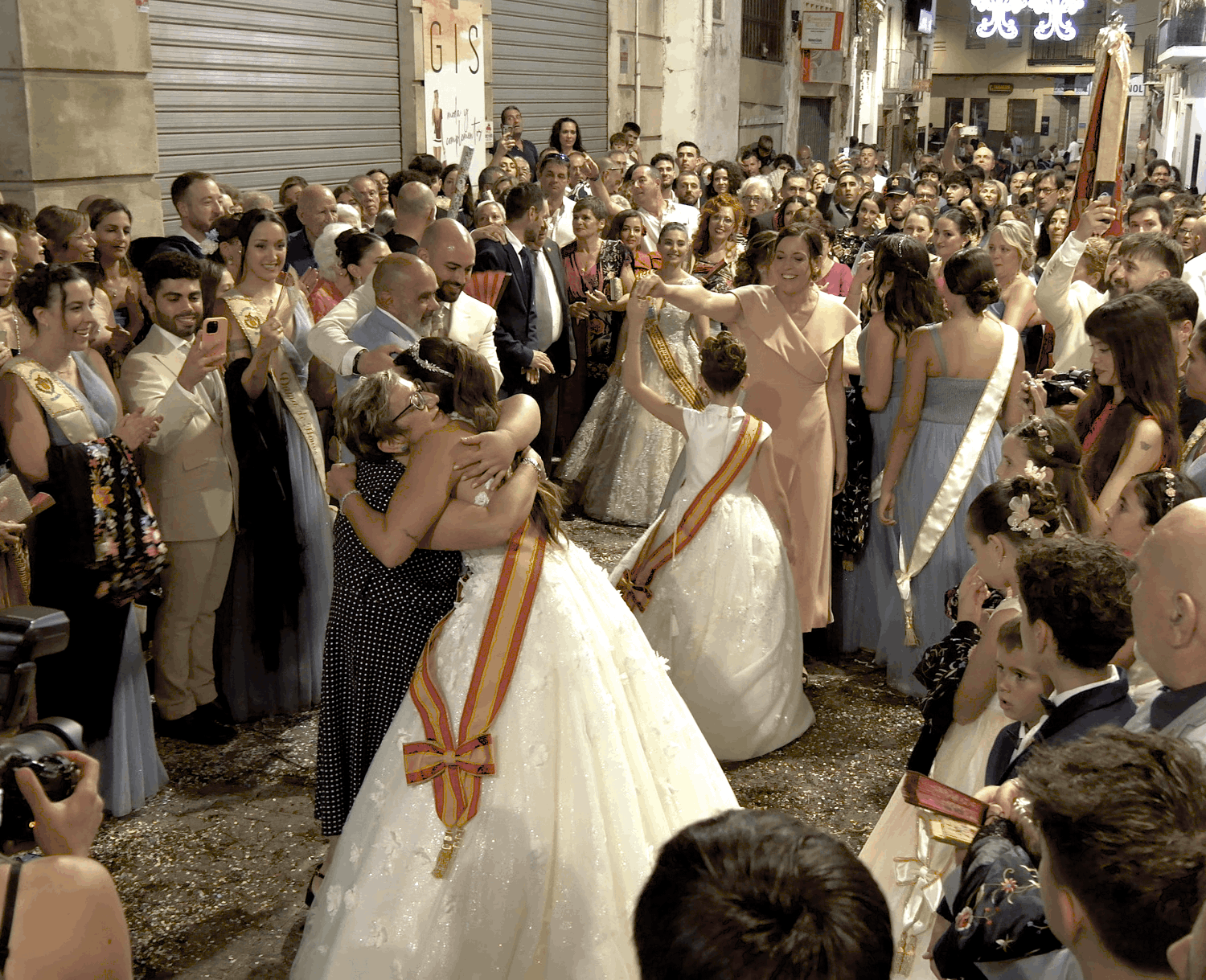 Finalmente, a pie, desfilan las Representantes y Reinas Mayor e Infantil de la Fiesta del Mantón del actual ejercicio, junto a sus Cortes de Honor. Tras ellas, con orgullo, desfila la Junta Directiva al ritmo de alegres notas musicales interpretadas por su banda. Este es el gran final. La multitud, quizás aún más numerosa que al principio, aplaude con entusiasmo, respondiendo al cálido y sonriente saludo de las reinas, quienes con lágrimas de emoción en los ojos, agitan incansablemente sus manos a ambos lados, como si quisieran saludar a todos. Y el pueblo se rinde ante ellas, porque en verdad parecen auténticas reinas, con sus impresionantes vestidos, joyas brillantes, coronas y bandas de Reinas de la Fiesta del Mantón.